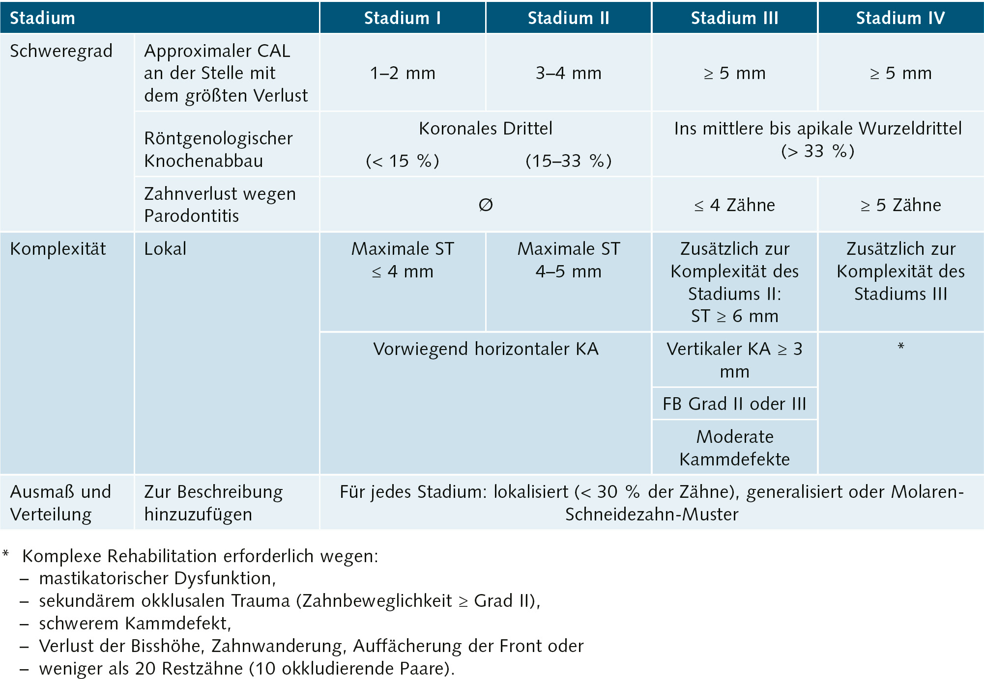 Tab. 7 Klassifikation der Parodontitis: Stadien basierend auf Schweregrad, Komplexität sowie Ausmaß bzw. Verteilung (CAL: klinischer Attachmentverlust; ST: Sondierungstiefe; KA: Knochenabbau; FB: Furkationsbeteiligung)1,9,10.