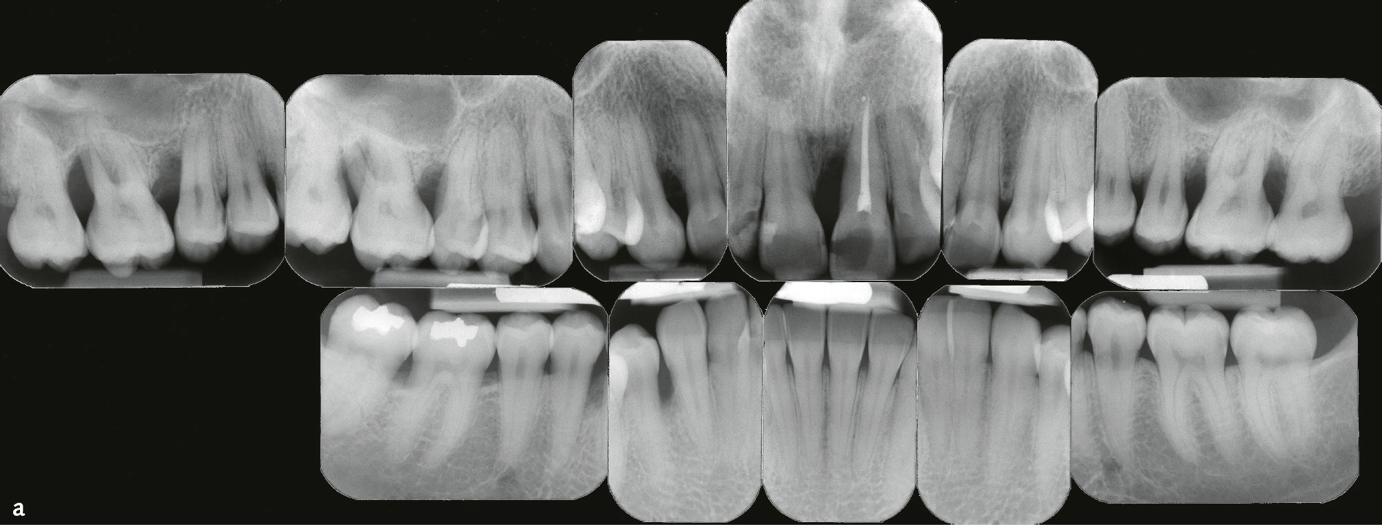 Die Parodontitis wird nach Schweregrad und Komplexität in vier Stadien unterteilt (Stadium I bis IV; Tab. 7). Primär sollte dafür klinischer Attachmentverlust (CAL) zugrunde gelegt werden, falls dazu keine Angaben vorliegen, röntgenologischer Knochenabbau (Abb. 4a). Dabei kann das Ausmaß als lokalisiert (< 30 % der betroffenen Zähne), generalisiert (≥ 30 % der betroffenen Zähne) oder Molaren-Inzisiven-Muster (s. „lokalisierte aggressive Parodontitis“) beschrieben werden. Im Unterschied zur Klassifikation von 19997 wird nur approximaler klinischer Attachmentverlust berücksichtigt. CAL aufgrund von Rezessionen, die keine entzündliche Pathogenese haben müssen8, bleiben unberücksichtigt. Für die Berechnung des Ausmaßes wird die Zahl der Zähne und nicht die der Stellen zugrunde gelegt (Tab. 7). Nicht nur CAL und Knochenabbau determinieren den Schweregrad, sondern auch durch Parodontitis eingetretener Zahnverlust. Es ist nicht mehr möglich, eine Parodontitis durch Extraktionen in einen niedrigeren Schweregrad zu transferieren. Sondierungstiefen (ST) spielen wieder eine Rolle und markieren zusammen mit BOP (Bluten auf Sondieren) den Unterschied zwischen einem stabilen Zustand nach erfolgreicher Parodontitistherapie (s. Tab. 3 und 4) und Parodontitis (Tab. 7). Entsprechend der Geschwindigkeit der Gewebezerstörung werden drei Progressionsgrade unterschieden: Grad A: langsame Progression, Grad B: moderate Progression, Grad C: rasche Progression (Tab. 8)9,10.