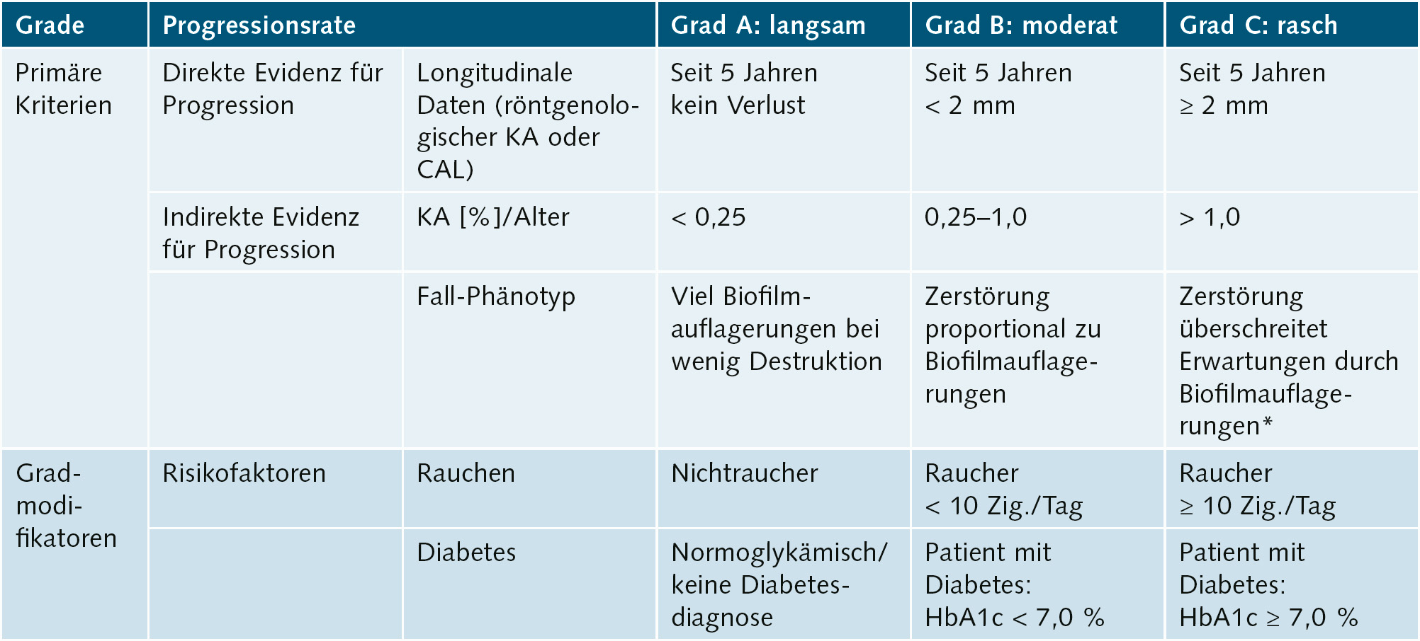 Tab. 8 Klassifikation der Parodontitis: Grade, die biologische Eigenschaften der Erkrankung widerspiegeln, wie Evidenz von oder Risiko für rasche Progression (CAL: klinischer Attachmentverlust; KA: Knochenabbau)1,9,10.