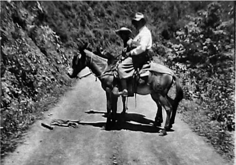 Nach Durchqueren des Flusses gelangen beide Maultiere zurück auf die Landstraße und traben einige Hundert Meter weiter, bis sie plötzlich scharf nach rechts abbiegen, um ruckartig einem steilen, engen Pfad schrittweise den Berg empor zu folgen. Der Trampelweg der Mulis schlängelt sich am Berghang entlang und führt an manchen Stellen für eine kurze Wegstrecke über ebene Pfade, doch dann folgen wieder steile Anstiege. Gelegentlich bleiben die Tiere kurz stehen, um am Wegrand saftiges Gras abzubeißen. Schließlich setzen sie, genüsslich kauend, ihren Weg fort.