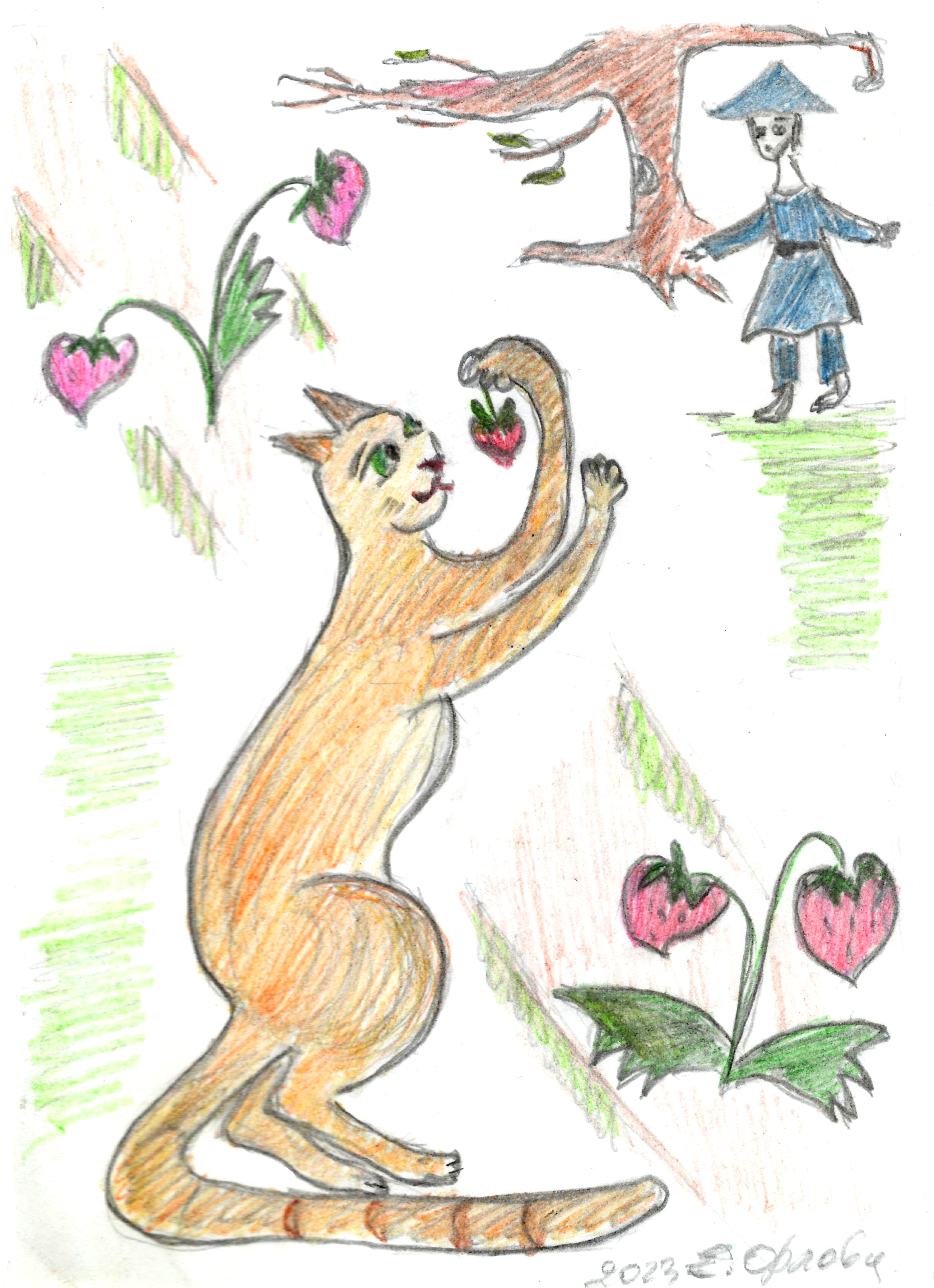 Рыжий кот весело затрусил вокруг полянки, нашёл клубнику, сорвал и съел, потом ойкнул и поднял на Чарли виноватые глаза.