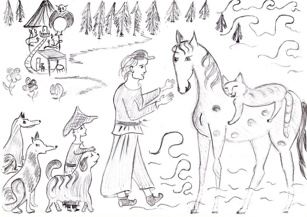 Все пошли на поляну смотреть, как кот будет ездить верхом на лошади. Волшебник поднял Макса и посадил его на спину Черногривке.