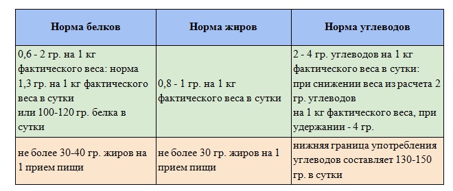 – правил потребления белка и жиров на 1 прием пищи не более 30-40 гр.; углеводов не более 60 гр. на 1 прием пищи.
