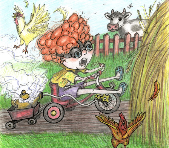 Колёса отлетели в стороны и покатились по траве. Из сена, запутавшись в картонной кабине, выбрался сам Саша. Он встал, отряхнулся и замахал рукой бабушке и Кларе, которые с испугом бежали к нему.