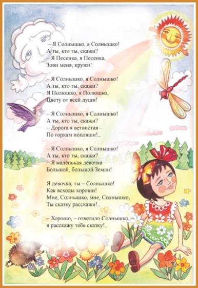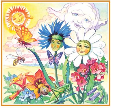Тёплым днём на небе сияло Солнышко. Оно дотрагивалось до каждой травинки, до каждого цветочка и деревца тёплыми, весёлыми лучами и пело песенку. И все, к кому обращалось Солнышко в этой песенке, подхватывали её: