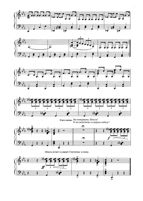 (Светлячок убирает шпагу, поворачивается и уходит. Шмель быстро поднимается, догоняет Светлячка и ударяет его сзади. Светлячок падает. Шмель торжествующе смеётся.)