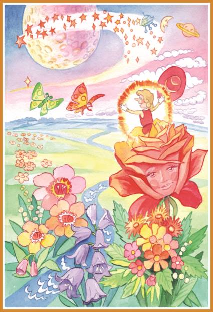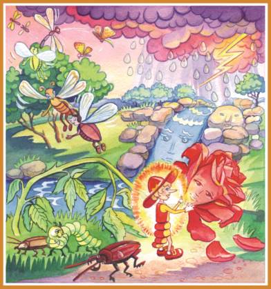 Скоро Розочка стала выздоравливать, и её стебелёк поднимался всё выше и выше. Вместе с Розочкой поднимался и Светлячок, который жил среди её лепестков. Перед ним впервые стал открываться удивительный просторный мир, который он никогда не увидел бы без помощи Розочки. Огонёк у Светлячка разгорался всё ярче и ярче, и от чувств, переполнявших его, он запел: