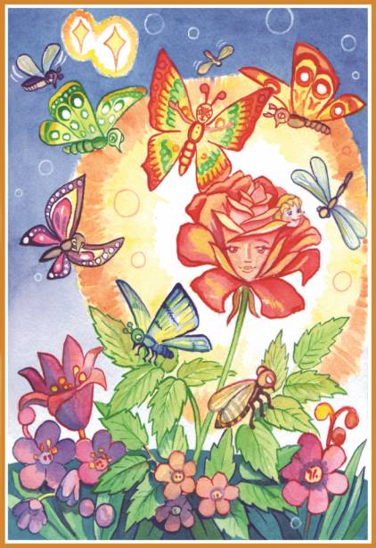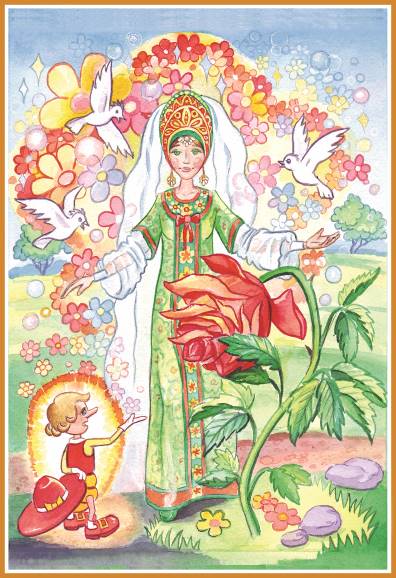 Неожиданно все цветочки и травинки радостно всколыхнулись, и посреди поляны расцвела Богиня Цветов! Она подошла к заболевшей Розочке и согрела её своими тёплыми руками. Листочки у Розочки стали расправляться, лепестки опять зарделись, и она стала оживать.