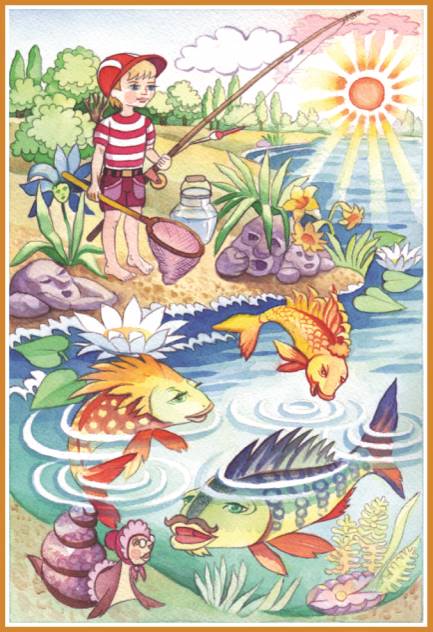 Вернув свой прежний облик, мальчик опять очутился на берегу озера с удочкой в руках. Рядом с ним находилась банка, в которой плавали, пойманные им, три рыбки. «Мне показалось, или я действительно превращался в рыбку?..» – подумал мальчик и взглянул на плавающих в банке рыбок. Он увидел, что они открывают свои беззвучные ротики, как будто пытаясь что-то сказать. «Просят, чтобы я их отпустил!» – догадался мальчик. Он взял банку и выпустил рыбок в озеро. На сердце у него стало тепло и радостно. Счастливые рыбки замелькали у поверхности воды и весело запели: