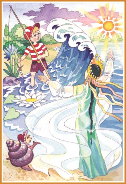 Мальчику-рыбке стало одиноко и страшно, но в это мгновение появилась Богиня Вод, которая обратившись к Мальчику-рыбке, произнесла: