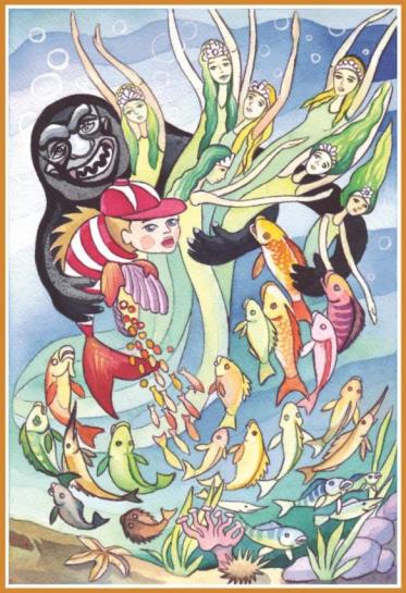 Перед Мальчиком-рыбкой открылся таинственный подводный мир, в котором всё было необычно: чудесные перламутровые раковинки, пышные водные сады. Посреди одного из них он увидел царственно-прекрасную Богиню вод, которая, обращаясь к нему, сказала:
