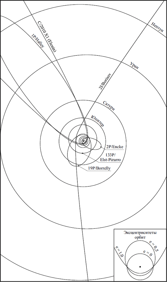Помимо комет семейств планет-гигантов, выделяют интересное семейство Энке, названное в честь первой подобной кометы – 2P/Encke. Можно сказать, что это «сверхкороткопериодические» кометы, орбиты которых полностью лежат внутри орбиты Юпитера. Подобных тел немного: пока их известно около семи десятков. К этому же типу объектов можно отнести и некоторые астероиды, которые с большой вероятностью могут оказаться не чем иным как неактивными ядрами уже мертвых комет. Многочисленные расчеты показали, что по законам небесной механики выход на подобные орбиты невозможен под действием только лишь гравитационных сил. Для этого требуются значительные негравитационные силы, вызванные активностью самой кометы.