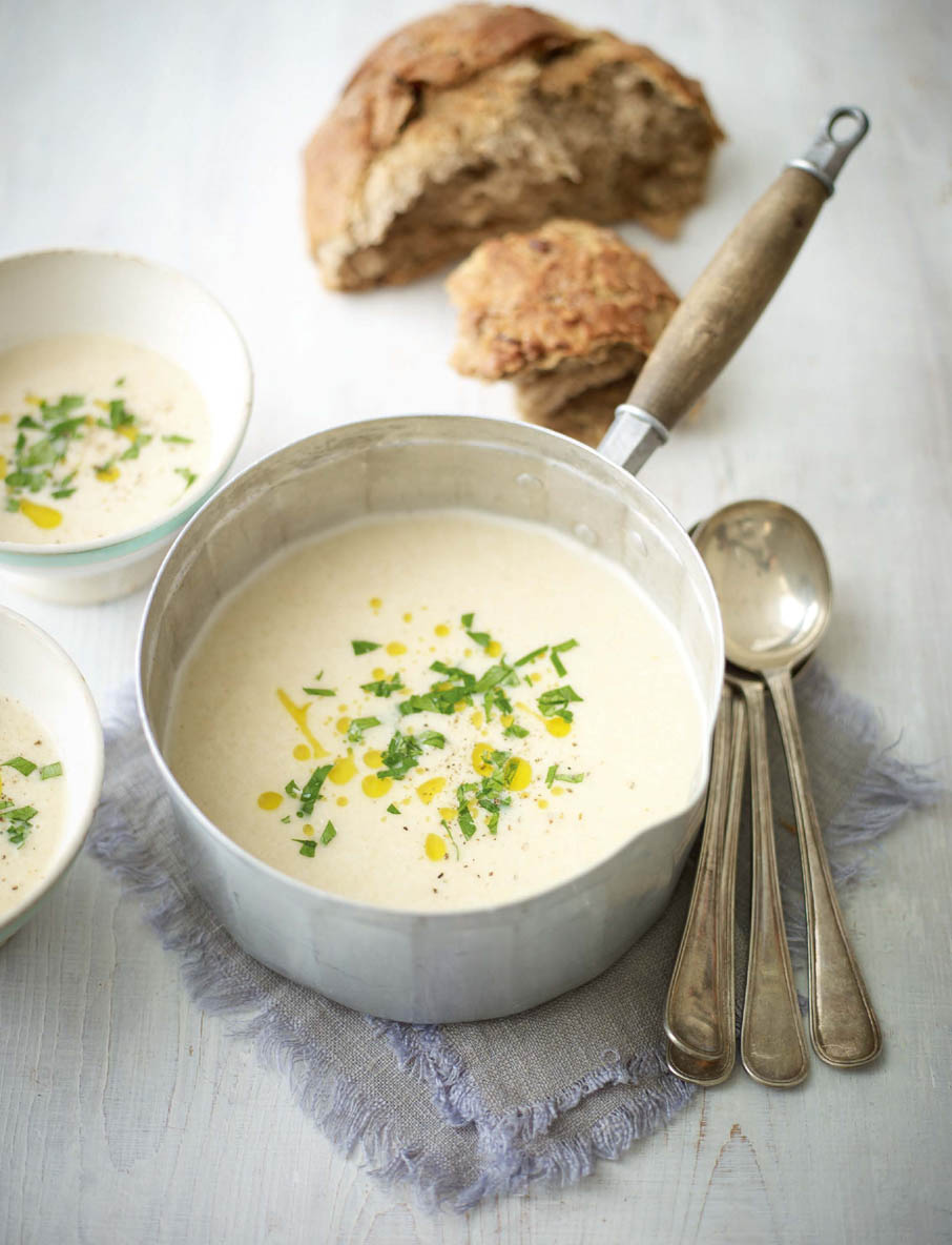 4. Serve the soup in warmed bowls, topped with a drizzle of extra virgin olive oil, if you like, some flat-leaf parsley and coarsely ground black pepper.