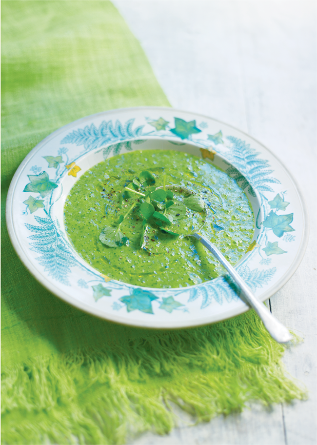 Reserve some small sprigs of watercress for garnishing (one for each bowl), and add the rest to the soup. Blend thoroughly to a smooth, bright green cream. Adjust the consistency with the remaining water to get it to the consistency you like.