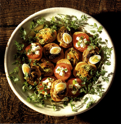 A selection of Crostini, topped with Mushroom Pâté, Plum Tomato, Mozzarella and Basil, and Goldy Greeny Spread