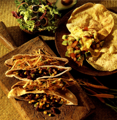 The tortillas that you can now buy make a goof fast-food snack, warmed through, filled with through, filled with tasty ingredients and then rolled up. They can be eaten immediately or topped with grated cheese and put under a hot grill to melt the cheese. The remaining tortillas will keep well in a polythene bag in the freezer.