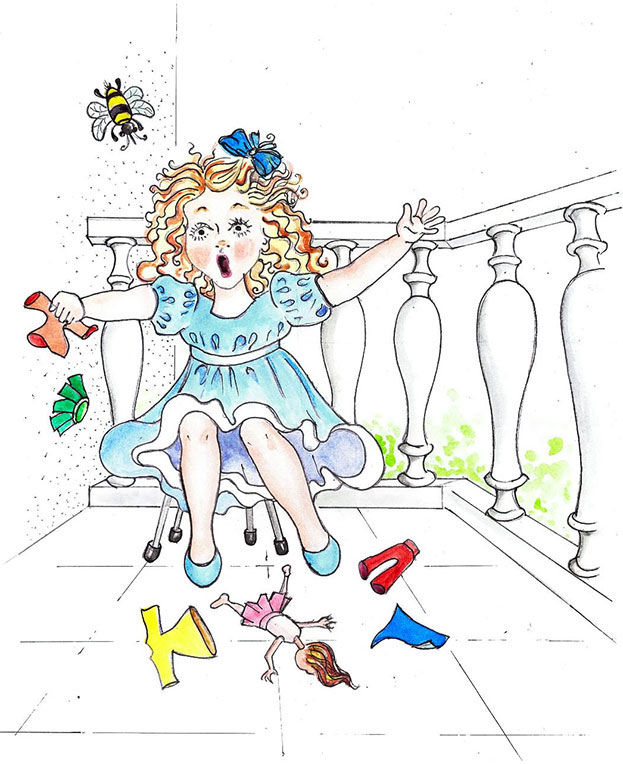 И вот однажды Аля сидела на балконе и играла в свои любимые куклы. Одёжки на них были само загляденье! Яркие, разноцветные и очень модные. Аля заботливо перекладывала их с места на место и каждые пару минут переодевала куколок. Вдруг вдали Але почудился знакомый устрашающий звук. Что – то жужжало! И это жужжание с каждой секундой усиливалось. Аля, открыв рот, в растерянности крутила головой направо и налево, готовая в любой момент завизжать. Вскоре её ожидания оправдались: она увидела маленькую пчёлку, летящую над её головой.