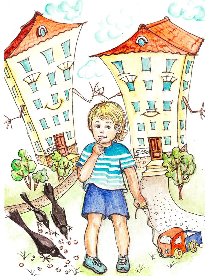 Наконец мама с бабушкой сдались. Гоша зажал в руке монетки и помчался в находящуюся неподалёку булочную. Издалека виднелась большая вывеска с нарисованным на ней только что выпеченным дымящимся хлебом. Гоша забежал в магазин и быстро купил хлеб. Гордый, что так легко справился с порученным ему заданием, Гоша вышел на улицу и огляделся. Вокруг стояло много совершенно одинаковых пятиэтажек. «Из какой это из них я выбежал?» – почесал он затылок в раздумьи. Не зная, что делать, он прислонился к берёзе и посмотрел в небо. С громким карканьем над ним пролетела стая ворон. Гоша по привычке принялся их считать, но вовремя спохватился. «Мама с бабушкой уже, наверное, беспокоятся!» – подумал он и нерешительно двинулся по дорожке. Вдруг на одном из зданий он увидел номер пять.