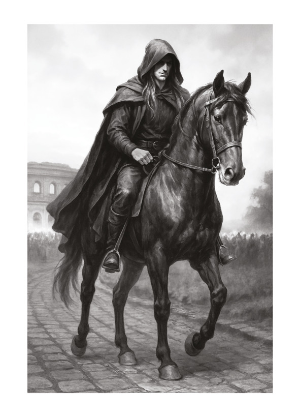 Странный человек тем временем оказался уже за пределами арены – в седле своего коня, такого же черного, как и полы его мрачной одежды.
