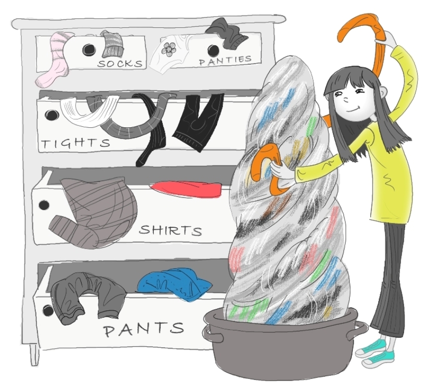 After standing a little longer at the window, Kate made her way to the closet to put away clean laundry. Not so long ago she discovered that the children's clothes got mixed up in the laundry and nothing could be found when needed. Therefore, it was much simpler not to sort the things according to their owners but label the drawers with a marker, and each would easily find their own there. Now on the drawers were large labels PANTS, SOCKS, SHIRTS, TIGHTS, SKIRTS.