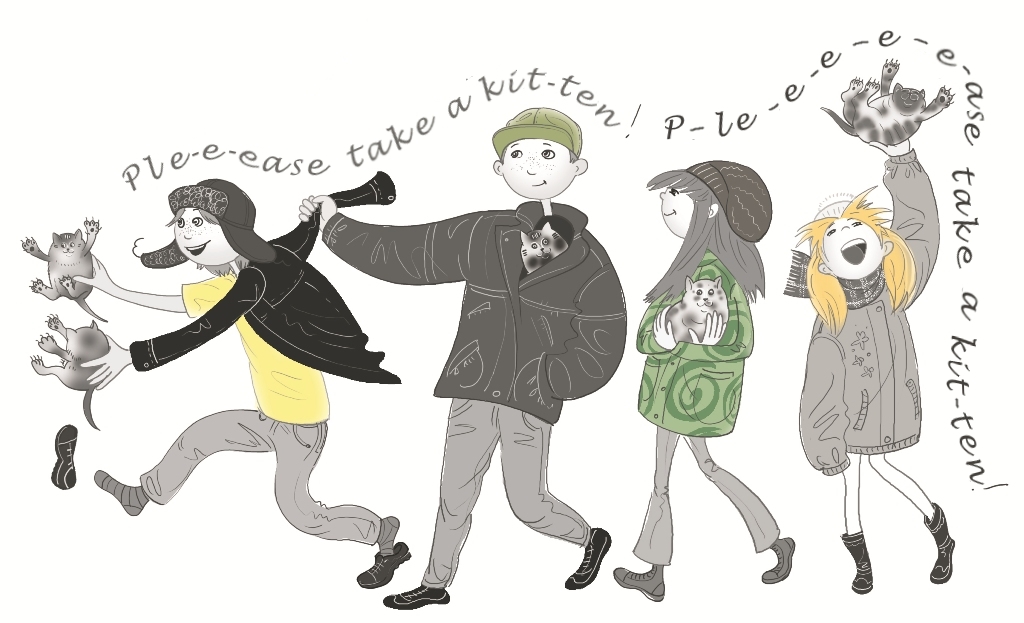 Seraphim and Andrew together with Alena and Kate repacked the kittens from the box to an old hat, went along the main street, and began to repeat plaintively, «Ple-e-ease take a kit-ten! Ple-e-ease take a kit-ten!»