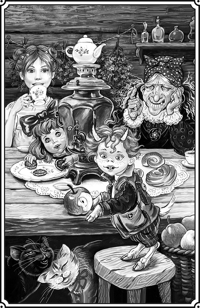 Пупс надулся, отошёл в другой конец избушки подальше от Яги и ногтем принялся сердито ковырять побелку на печке. На лавке Куклаваня заприметил корзиночку с красными яблоками, покосился на хозяйку и, незаметно стащив яблочко, откусил половину. Не успел он её проглотить, как ощутил, что с ним творится неладное. Его коротенькие ножки вытянулись, а на голове прорезались рожки.