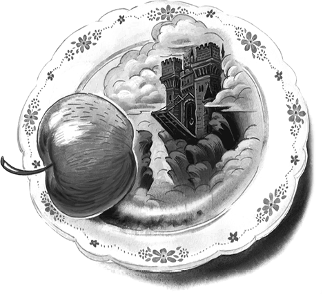 Яга пустила по блюдцу волшебное яблоко. По донышку сразу пошли помехи, как у расстроенного телевизора. Потом на блюдце появилось изображение неприятного гнетущего места: тяжёлые скалы, нависшие над едва заметной тропой, низкое серое небо и большая крепость с башнями и подъёмным мостом. Высоченные стены крепости, окружённой рвом с водой, поросли мхом. В окрестностях не было видно ни души.