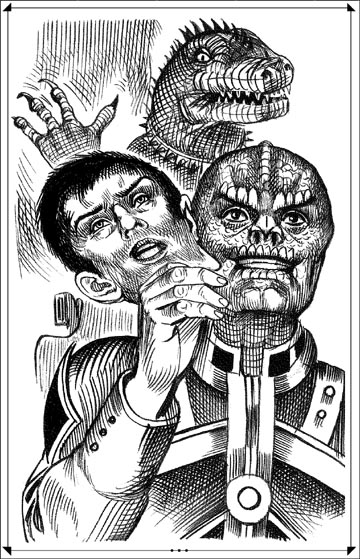 – Оно и сейчас такое. – Мутант поднял руки, схватился пальцами за что-то возле ушей и резко рванул. То, что было похоже на человеческую розовую кожу, отошло вместе с ушами – это оказалась тонкая маска из эластичного пластика. Под ней лицо капитана было чешуйчатым и страшным, настоящим лицом космического мутанта.