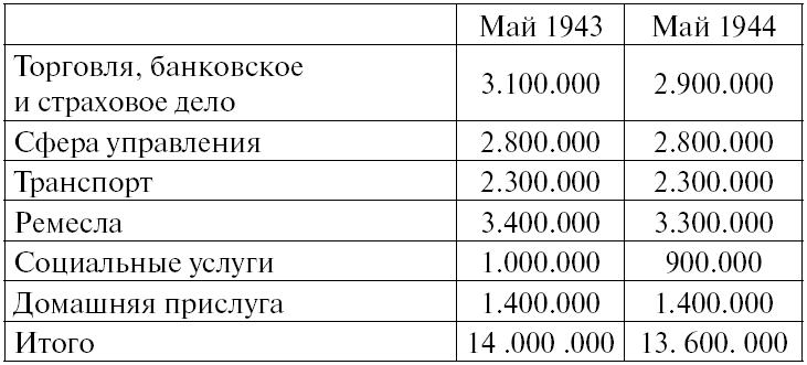 Хотя 26 января 1943 г. Шпеер поставил задачу «перевести один миллион немцев в военную промышленность», она осталась невыполненной. Он привел следующие статистические данные по распределению рабочей силы в ряде отраслей, за счет которых могла быть решена эта задача.
