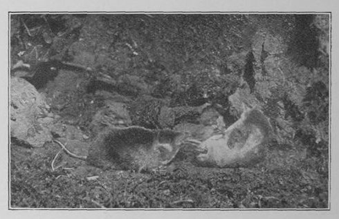 They hurled themselves at random, they bit at random, they bucked and somersaulted, they spun entwined in loops and twists, in double-knotted tangles, in sinuous figures of eight. Now one was on his back and now the other—shrewmice reck little which way up they fight. Now they sped screaming up the trunk and all but reached the Pygmy; now they dropped earthward with twin thud, and grazed a red vole's nose. So without pause or respite. They tore and scratched and gripped and pulled and wrenched and tugged and jumped and squealed until–it was an earthquake, a rounded dull upheaval, a split and crackle of the moss, a sputter of dry dust, and, in the midst, like some queer fungus growth, the mole's red nose.