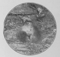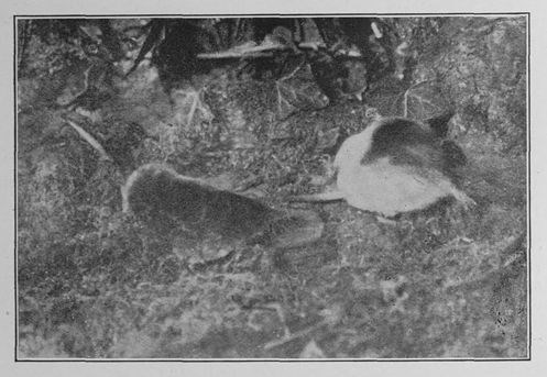 He was quite right; the combatants had passed that way. It was a zigzag run, but unimpeded. A drooping grass-stem tangle formed its roof, and, through long use, its sides were brown and withered, as though some noxious snake had glided through, and poisoned every growing blade it touched. The Pygmy knew it end to end, and knew that, where it broke, close to the elm, there was a moss-grown clearing. So he took matters quietly, and, lingering as the fancy took him, had supped before he reached the fighting-ground. The common shrews were feinting for an opening. He knew them both by sight. One, a brown-coated, thick-set scaramouch was neighbour to him in the stump. The other was a meadow-shrew, of lighter build and colour, but longer and full match in weight. The Pygmy rubbed his nose between his paws—a pretty fight was promised.