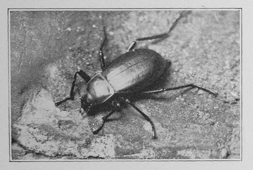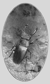 Perhaps I ought to tell you how to know a beetle when you see one. This sounds easy enough, but it is not quite as easy as it sounds. All beetles have six legs (beetles' bodies are divided into three parts, and the legs grow out of the middle part); nearly all of them have strong, horny covers for their wings, and all of them have their skeletons outside. This sounds a very topsy-turvy arrangement, but it is quite true. We have our bones inside, and our flesh outside, but beetles have their bones outside and their flesh inside. Sometimes you may see beetles crushed flat in the road, but often they are trodden on or run over without being killed; and the reason for this is that their hard, outside skeletons prevent their soft insides from being altogether squashed up. Once I ran over a Stag-beetle on my bicycle—it was nearly dark at the time, and I was over him before I could get out of his way. Now a big Stag-beetle weighs about an eighth of an ounce, and I am rather a heavy person—indeed, with my bicycle thrown in I should think that I must weigh over two hundredweight, which is about thirty thousand times as much as the Stag-beetle. You can imagine how surprised I was to find that the Stag-beetle was not hurt. I ought to tell you, though, that the road was soft, and that my bicycle-tyres were not blown up hard, so perhaps the Stag-beetle did not get all my weight on his back—but, anyhow, it was a wonderful escape for him, wasn't it?