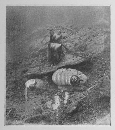 The Female Stag-Beetle, whose antlers are quite short, and two Stag-Beetle Grubs