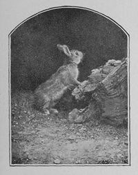 The burrow winds in four sharp turns, and, at each one, he stubbed his nose. This through a mad desire to keep near Mother; for Mother's tail bobbed in quick jerks, shaving each corner to a hair, and he and all his brothers raced to catch it. They reached the entrance packed as one, but Bunny Rabbit, squirming clear, shot past the uplifted paw, butted his waiting Father, flung off him like a smoke-puff, and landed on his back six feet below.