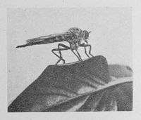 Another big and beautiful insect is the Musk Beetle. As you see in the picture, he has very long horns and a narrow body. He is a beautiful bronze green all over, and must be a wonderful sight when he is flying in the sunshine. I have never seen him fly myself, but people who have say that his legs and horns stream out behind him, so that he must look like a little green Heron. Perhaps the most wonderful thing about him, however, is his scent. I expect most of you know those little round pink sweets which are called "cachous." He smells just like the taste of those, and that is why he is called Musk Beetle.