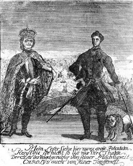 Петр I и Карл XII. Немецкая гравюра. 1728 г.