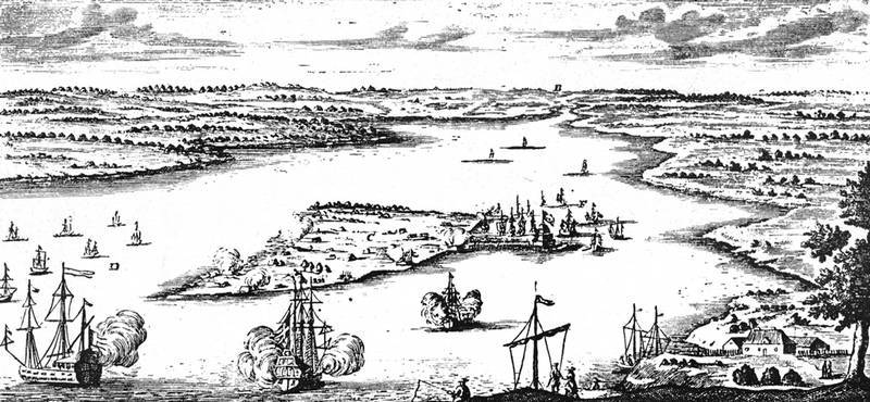 Остров Котлин и Невское устье. Гравюра датируется концом XVII в. и ошибочно названа «Вид на Петербург…». Но, если судить по изображению, Петербурга еще нет и в помине, а флот, по всей видимости, шведский