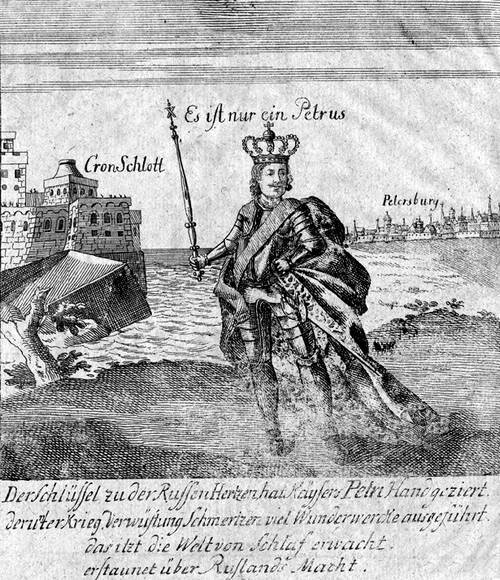 Как пример можно привести немецкую книгу, вышедшую в 1734 году во Франкфурте. В ней помещалась великолепная гравюра с Петром Великим, стоящим на фоне Кроншлота и Санкт-Петербурга. Сам царь довольно реалистично представлен в доспехах, обрамленных императорской горностаевой мантией, в короне и со скипетром в руке. Но форт Кроншлот напоминает не приневскую цитадель, а какую-нибудь мавританскую крепость на юге Испании. Единственное, что достоверно в этом изображении – своеобразный «надолб», который перекрывает фарватер. Известно, что в 1706 году, в связи с активизировавшимися близ Кронштадта шведами, царь приказал завалить камнями удобные подходы к берегу.