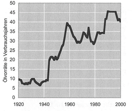 Ölvorräte in Verbrauchsjahren, Ölreserven weltweit Im Vergleich zur Jahresproduktion, 1920–2000 (bis 1944 nur USA); Quelle: B. Lomborg, Apocalypse No!, Abb. 66