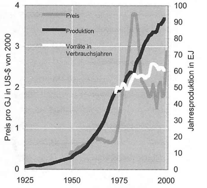 Weltweite Erdgasförderung. Erdgaspreise, Vorräte in Verbrauchsjahren. Förderung in Exajoule 1925–1999, Preise 1949–2000 in US-$ von 2000 pro Gigajoule und Vorräte in Verbrauchsjahren 1975–1999; Quelle: B. Lomborg, Apocalypse No!, Abb. 69