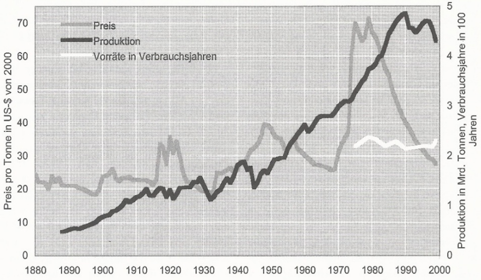 Weltweite Kohleförderung, Preis und Vorräte in Verbrauchsjahren, Förderung in Mrd. Tonnen1888–1999, Preis pro Tonne in US-$ von 2000 und Vorräte in Verbrauchsjahren 1975–1999 in hundert Jahren; Quelle: B. Lomborg, Apocalypse No!, Abb. 70