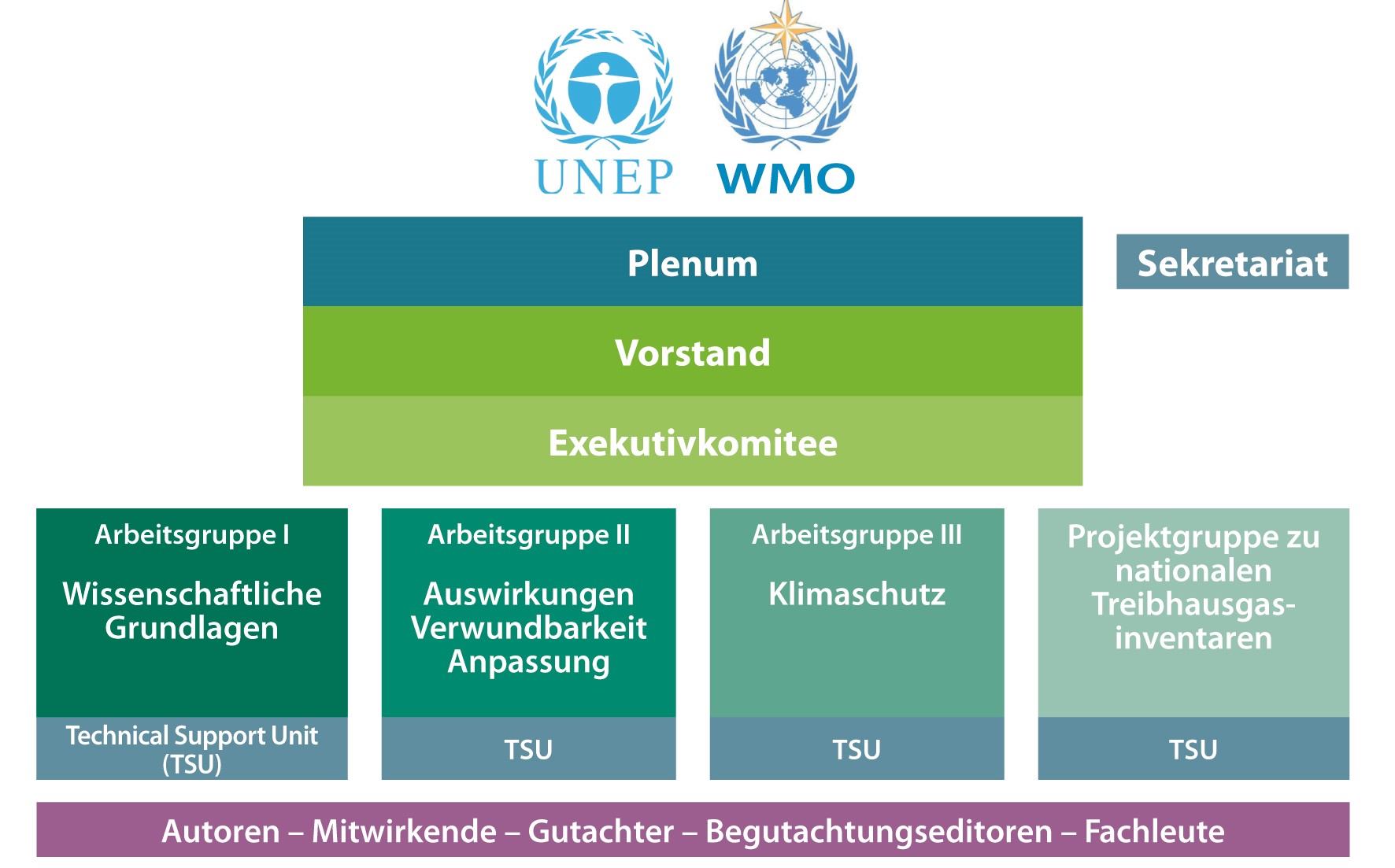 Organisation des IPPC. Grau: Beteiligte Regierungen mit entsandten Fachleuten, grün: Wissenschaftler, blau: unterstützende Organisationen; Quelle: IPPC