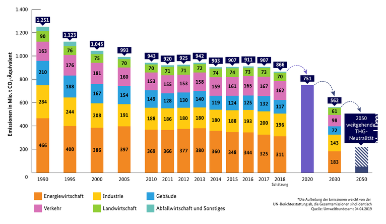 Treibhausgasemissionen für Deutschland seit 1990, gestaffelt nach Bereichen: bei Trendfortsetzung werden die Ziele verfehlt; Quelle: Umweltbundesamt 2019