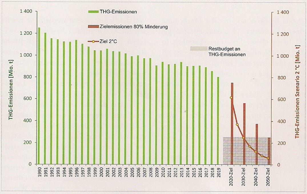 Übersicht über die Entwicklung der THG-Emissionen in Deutschland nach Stand Sept. 2020, mit Ausblick auf 2-Grad-Scenario; Quelle: BKW Jahresausgabe 2020, S.64