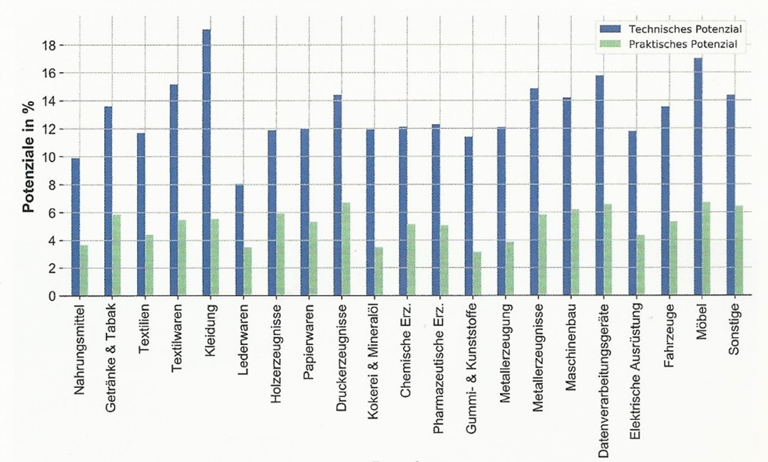 Technisches und real umsetzbares Effizienzpotential in der produzierenden Industrie nach Branchen 2020; Quelle: N.A. Industrry Classifikation System und Datenbasis IAC