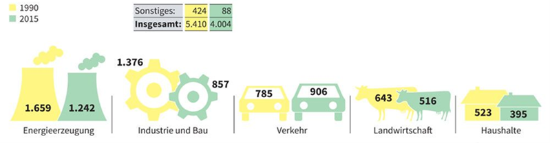 Treibhausgasemissionen in der EU 1990 /2015, nach Wirtschaftssektoren; Quelle: IDW 2017, urspr. IAE 2017