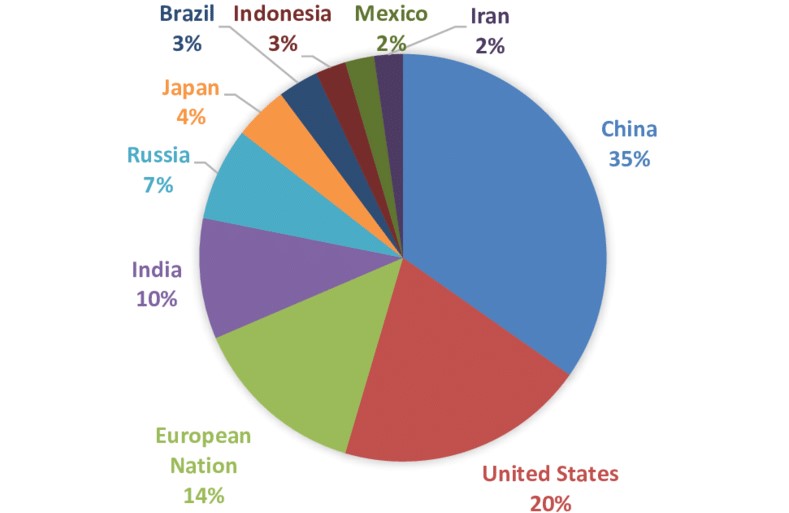 Regional sind die Verursacher sehr ungleich verteilt, s. Abb. 6‑3. Vom gesamten CO2-Ausstoß von weltweit 32,3 Mrd. t entfiel nach Abb. 6‑4 im Jahr 2017 die Hälfte auf nur 3 Emittenten: China rd. 9 Mrd. t, USA rd. 5 Mrd. t und Indien rd. 2 Mrd. t.