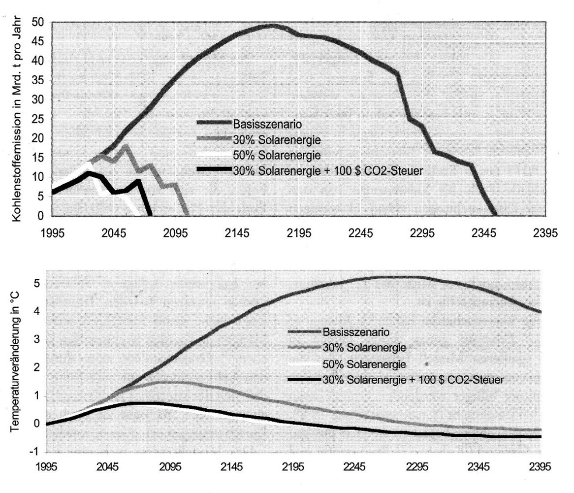 Das Basisszenario der oberen Kurve überlässt den Verlauf allein den Marktkräften, während die übrigen Szenarien eine schnellere, ggf. auch durch Förderung erreichte Substitution annehmen. Im Basisszenario wäre dann in rd. 160 Jahren ein Maximum der CO2-Konzentration und in rd. 270 Jahren ein maximaler Temperaturanstieg von rd. 5 °C erreicht, mit danach jeweils wieder absinkenden Werten.2