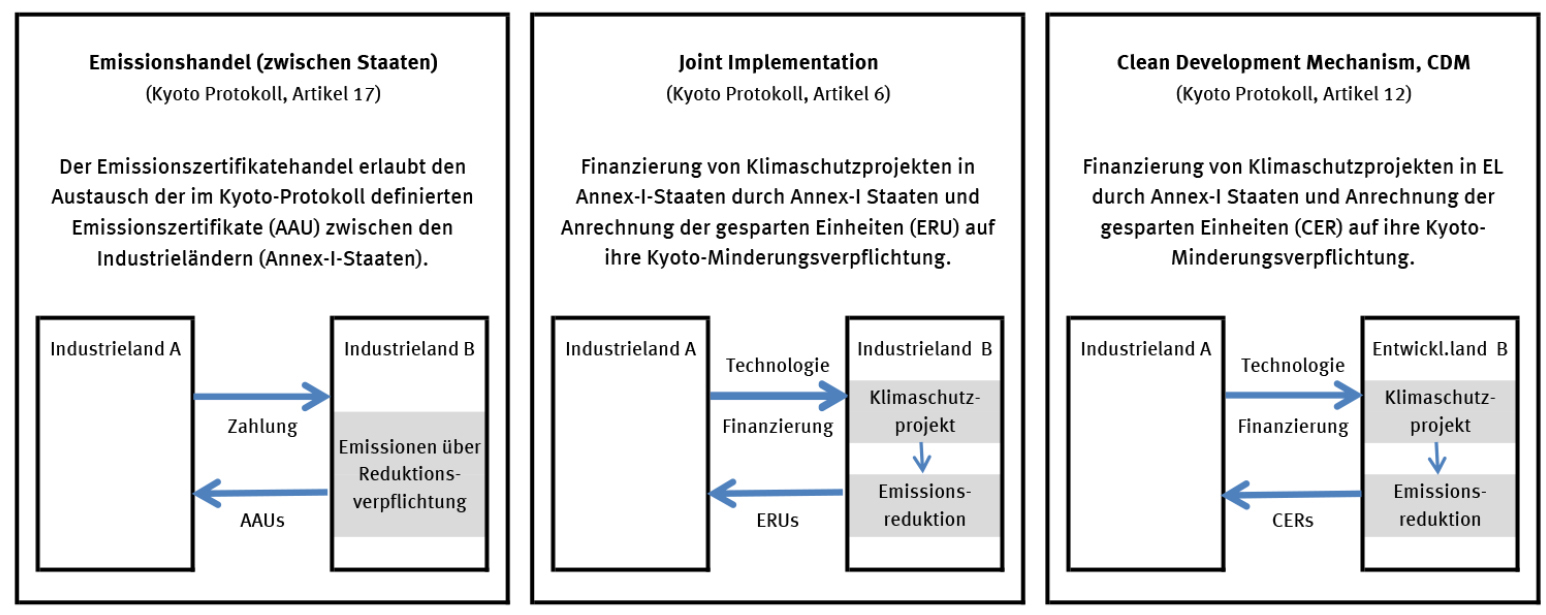 Der Emissionshandel ist Teil der sogenannten Flexiblen Mechanismen des Kyoto-Protokolls, die im Schema der Abb. 7‑9 dargestellt sind. Der hier interessierende Emissionshandel ist in Artikel 17 des Kyoto-Protokolls geregelt. Handelsteilnehmer sind die in der Protokollanlage B genannten Industriestaaten.