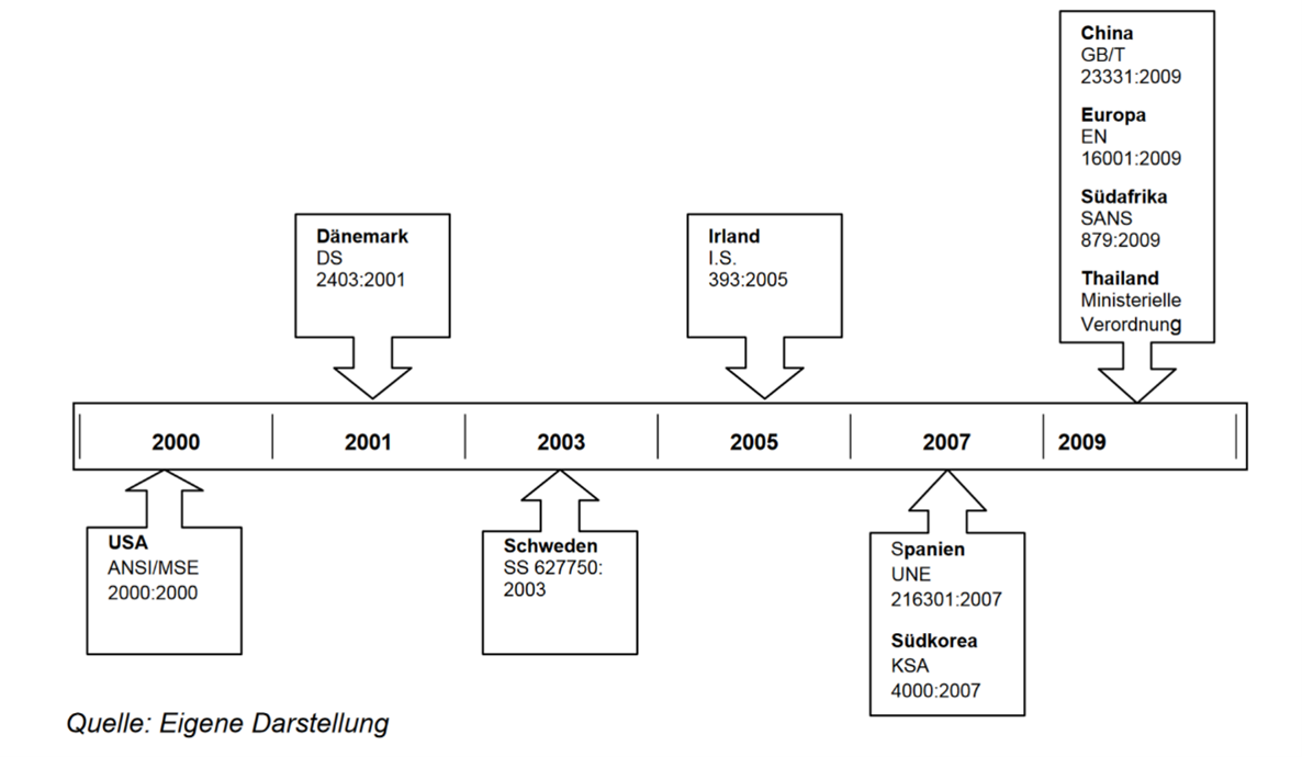 Zeitstrahl zur Entwicklung nationaler Energiemanagementnormen; Quelle: UBA, Energiemanagement als Erfolgsfaktor, Dessau-Roßlau, November 2010